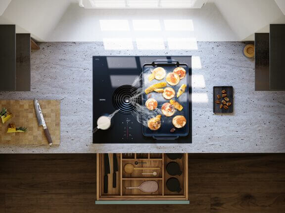 The BORA S Pure is the most compact BORA system – perfect for 600 mm kitchen cabinets. The asymmetric extraction opening makes a striking design statement. Surface induction on the right with bridge function provides a generous cooking area. sControl+ and BORA Assist ensure intuitive operation and intelligent cooking programmes – with matte Rough glass ceramic that conceals fingerprints.
